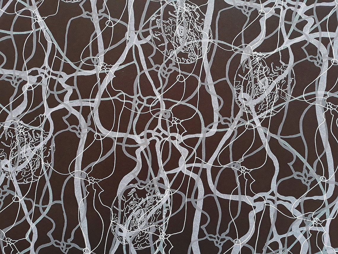 MRI imaging technology can delve deep into the brain, the core of our realities. At the base of the brain lies a ring of arteries that supply the brain's blood supply. Medically, it is known as the Circle of Willis, but has also been described by the spiritual philosopher and social psychologist Diarmuid O’Murchu as one of the “sacred spaces in nature”. I appropriated the MRI pattern of the Circle of Willis to extend into the metaphor of desire.